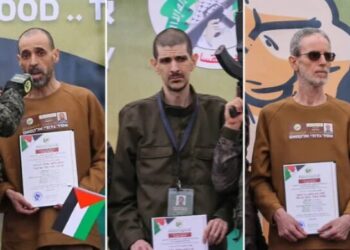 Los tres rehenes liberados este sábado por el grupo terrorista Hamás en la Franja de Gaza, Ohad Ben Ami, Eli...