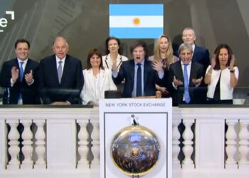 El presidente de Argentina, Javier Milei, protagonizó este lunes el toque de campana en la Bolsa de Nueva York junto...