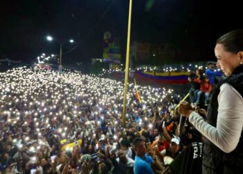 La líder opositora María Corina Machado encabezó la noche de este martes una multitudinaria concentración en el viaducto Campo Elías...