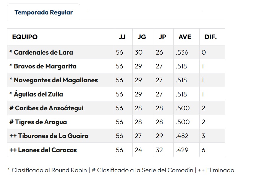 Cierran la tabla los eliminados Tiburones de La Guaira, con registro de 27-29 y average de .482, y Leones del Caracas, que presenta marca de 24-32, promedio de .429 y una diferencia de seis juegos frente al líder de la temporada regular.