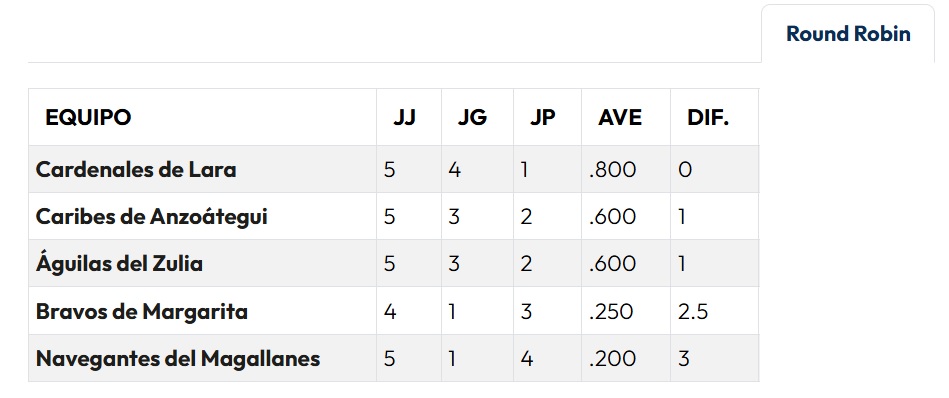En el fondo de la clasificación figuran los Navegantes del Magallanes, con apenas una victoria en cinco compromisos y promedio de .200. Con tres juegos de diferencia respecto al liderato, el equipo eléctrico está obligado a reaccionar rápidamente si quiere mantenerse con opciones en el round robin.