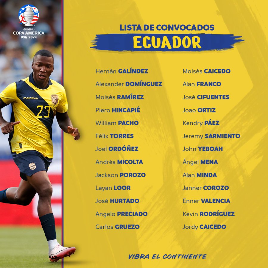 Defensas (9): Piero Hincapié, Félix Torres, José Hurtado, William Pacho, Ángelo Preciado, Layan Loor, Jackson Porozo, Andrés Micolta y Joel Ordóñez.