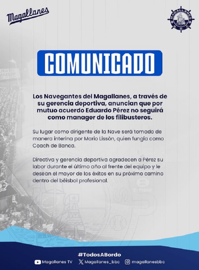 Navegantes del Magallanes anunció en sus redes sociales de la desvinculación con Eduardo Pérez como mánager del equipo “por mutuo acuerdo”, apuntó la organización en un comunicado, la madrugada del jueves. Su lugar lo asumirá, de manera interina, Mario Lissón, quien fungía como coach de banca.