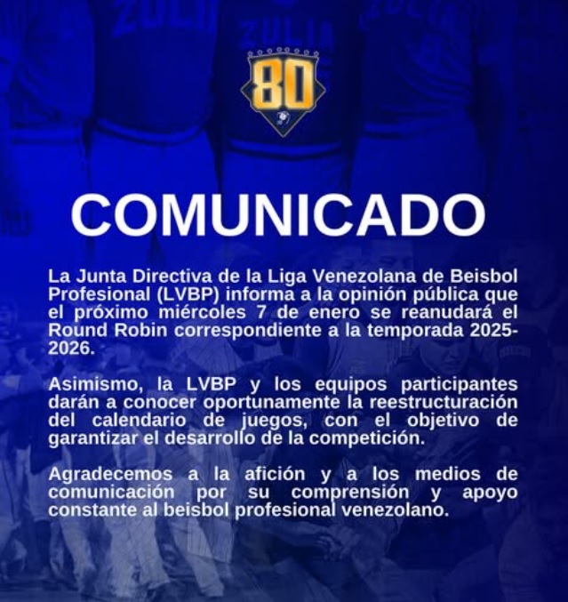 Mediante un comunicado, la junta directiva de la Liga Venezolana de Béisbol Profesional (LVBP) informó a la opinión pública que este miércoles 7 de enero se reanudará el round robin correspondiente a la temporada 2025-2026.