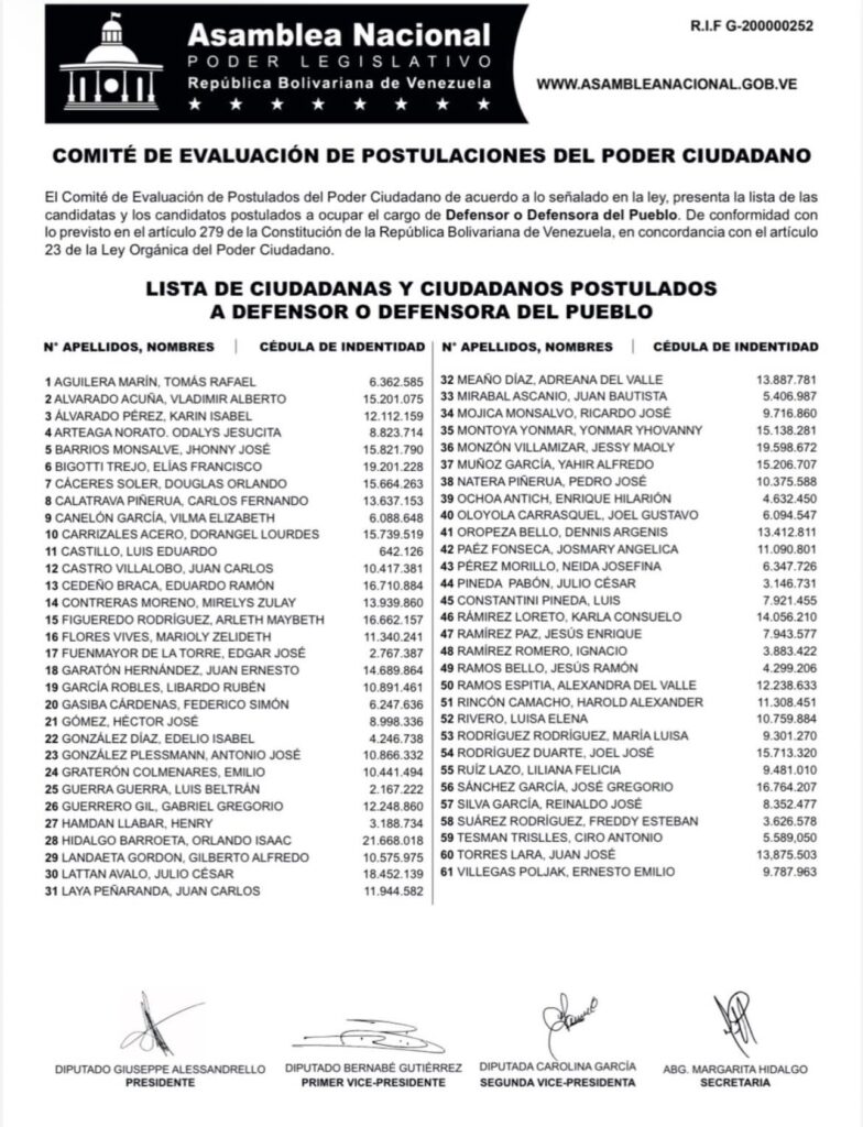 Este lunes se conoció la lista de las 61 personas que se postularon al cargo de Defensor del Pueblo, en el proceso iniciado por la Asamblea Nacional controlada por el chavismo tras la renuncia de Alfredo Ruíz.