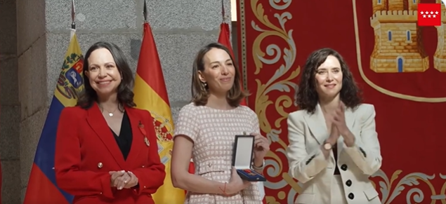 Durante el acto, Ayuso hizo entrega de la Medalla de Oro de la Comunidad de Madrid a Machado y de la Medalla Internacional a González Urrutia, en reconocimiento a su trayectoria en defensa de la libertad, la democracia y los derechos humanos.