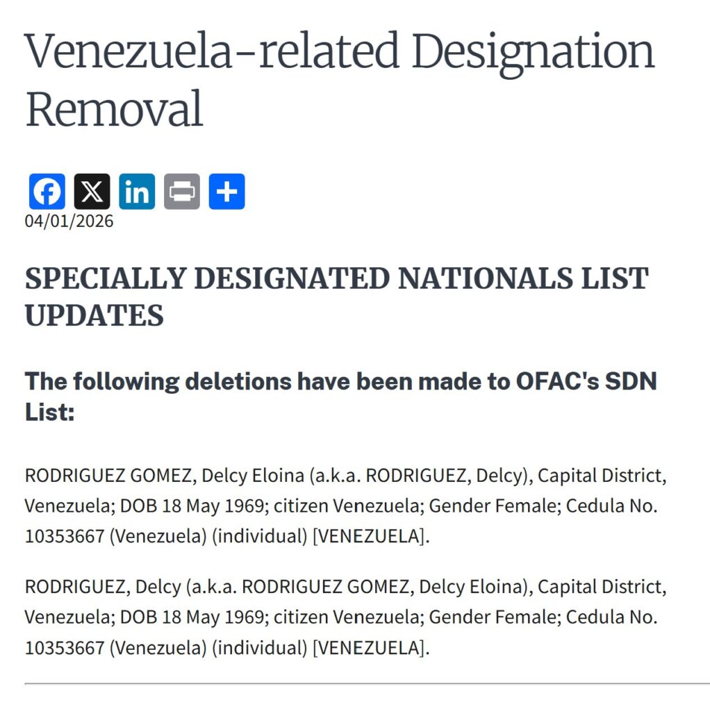 La eliminación de Rodríguez de la lista OFAC implica que ya no está sujeta a las restricciones financieras y comerciales impuestas por Estados Unidos a individuos designados bajo programas de sanciones relacionados con Venezuela.