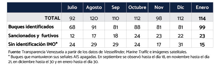 Según el monitoreo, en enero se observaron 114 buques, cifra similar a diciembre (112), pero con cambios sustanciales: 99 embarcaciones navegaron con su señal AIS encendida, el número más alto desde que inició el seguimiento, y 18 más que en diciembre. Solo 15 buques operaron en modo oscuro, la mitad de los 31 detectados en diciembre, y el número más bajo registrado hasta ahora.