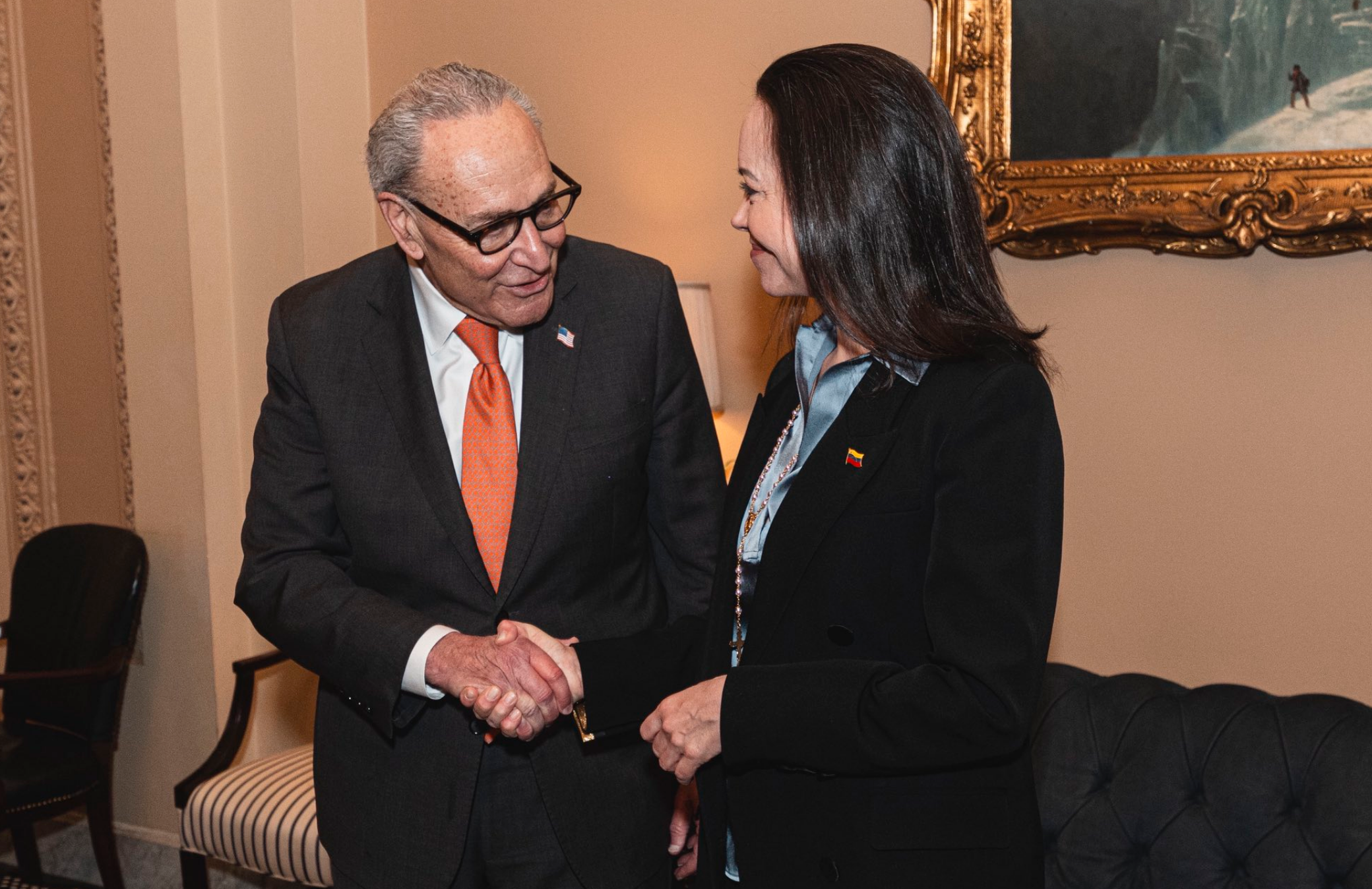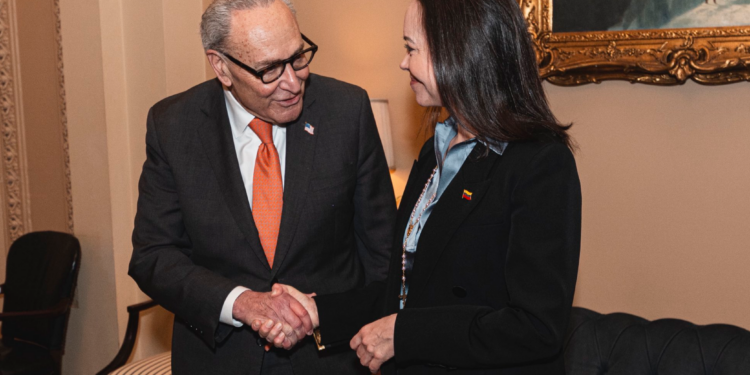 “Fue un honor reunirme con la líder del movimiento democrático venezolano y laureada con el Premio Nobel de la Paz, María Corina Machado, para hablar sobre nuestro apoyo a una Venezuela libre y democrática. Su valentía y resiliencia son una inspiración para todos los que defienden la libertad”, expresó Schumer en un mensaje público, destacando el rol de Machado.