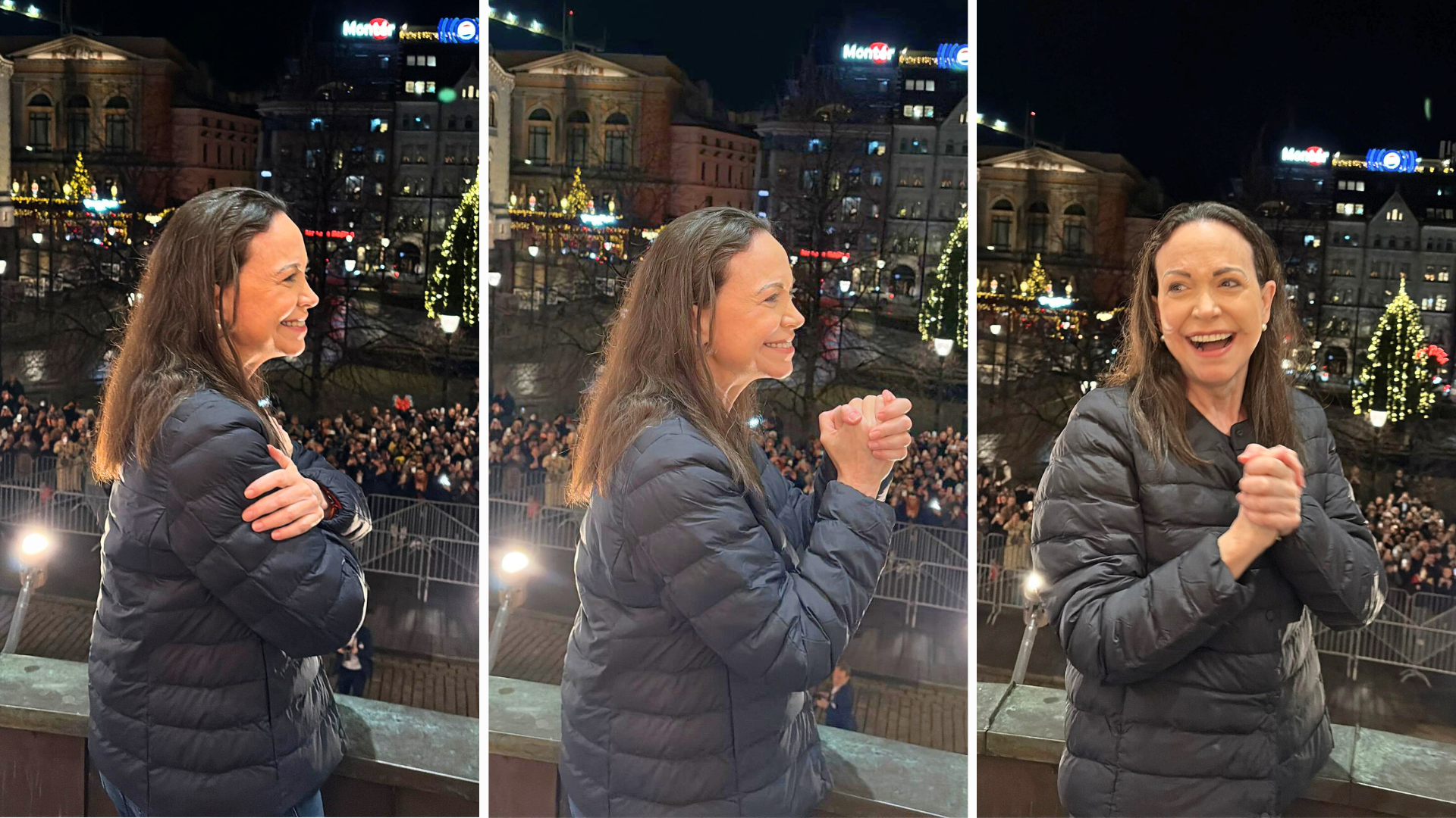 La líder venezolana y Premio Nobel de la Paz María Corina Machado llegó a Oslo la noche de este miércoles (madrugada del jueves en Noruega) y, tras encontrarse con su familia, salió al balcón del Grand Hotel a saludar a los venezolanos que la esperaban concentrados en la calle.