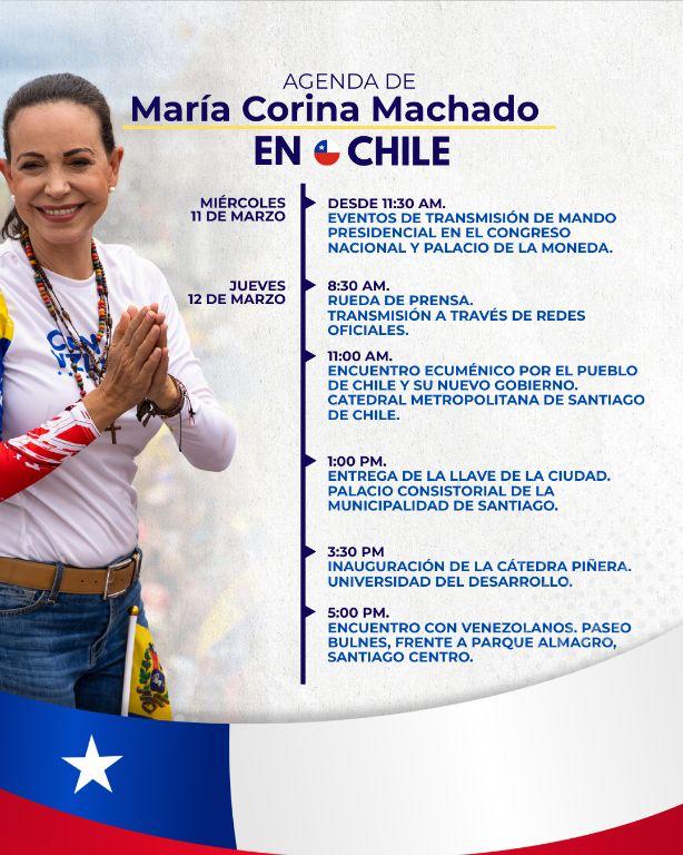 Machado cumplirá una agenda de dos días en Santiago, que incluye actividades oficiales vinculadas al cambio de mando y encuentros con autoridades, académicos y la diáspora venezolana. Este miércoles asistirá a los actos de transmisión de mando en el Congreso Nacional y en el Palacio de La Moneda.