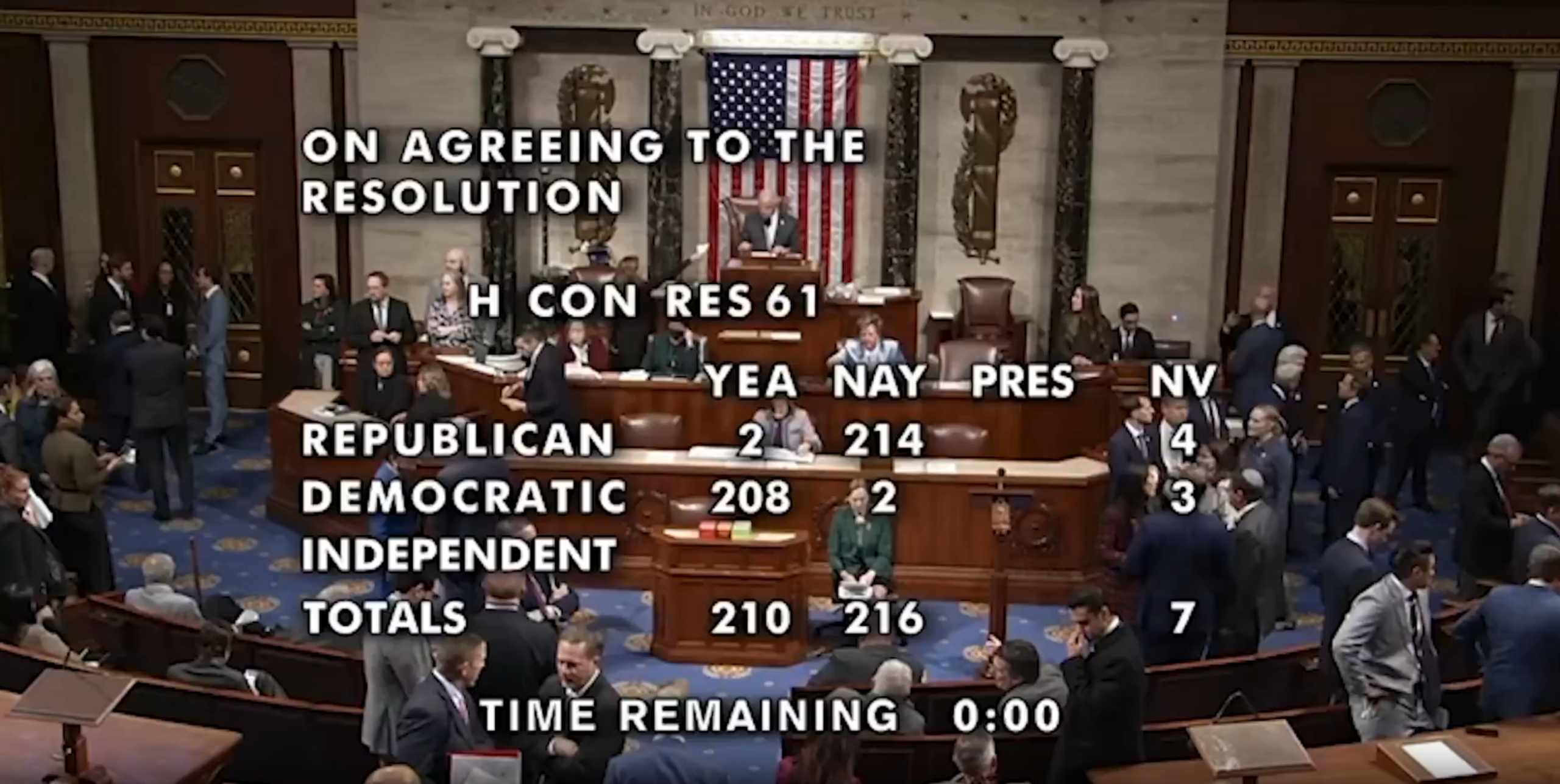 El hemiciclo rechazó en primer lugar, por 216 votos a favor y 210 en contra, la resolución concurrente 61, que invocaba la capacidad del Congreso para «retirar a las Fuerzas Armadas de Estados Unidos de hostilidades con organizaciones terroristas designadas por el presidente en el hemisferio occidental».