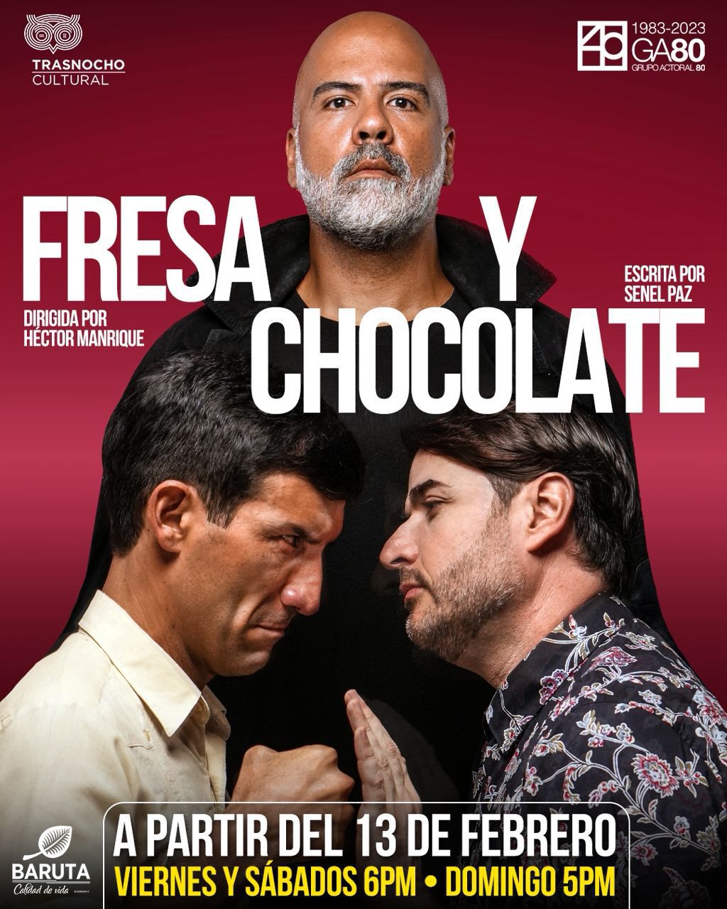 El Grupo Actoral 80 trae de nuevo a las tablas su aclamado montaje de “Fresa y Chocolate”, comedia dramática del cubano Senel Paz que ha sido inmortalizada en el cine y que bajo la dirección de Héctor Manrique y las actuaciones de Daniel Rodríguez, Adolfo Nittoli y Jesús Das Merces, regresa al Teatro Trasnocho desde el viernes 13 de febrero, con funciones los días viernes y sábados a las 6 pm, y los domingos a las 5 pm.
