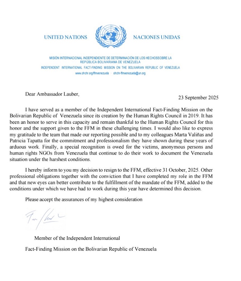 «Por la presente, le informo mi decisión de renunciar a la Misión, con efecto a partir del 31 de octubre de 2025. Otras obligaciones profesionales, junto con la convicción de que he cumplido con mi papel en la Misión y de que nuevas miradas pueden contribuir mejor al cumplimiento de su mandato, sumadas a las condiciones en las que hemos tenido que trabajar este año, han determinado esta decisión«, escribió Cox Vial en su carta fechada el 23 de septiembre de 2025.