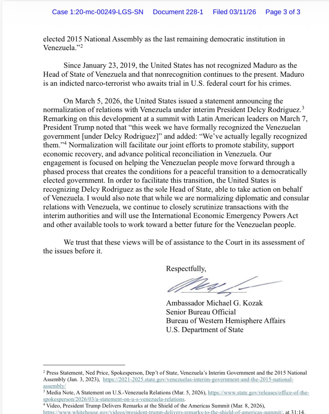 El encargado para Latinoamérica del Departamento de Estado, Michael Kozak, envió una carta al fiscal Jay Clayton para que comunique a la corte que «(…) nuestro compromiso está enfocado en ayudar a los venezolanos a avanzar mediante un proceso de fases que cree las condiciones para una transición pacífica hacia un gobierno elegido democráticamente. Para facilitar esta transición, Estados Unidos reconoce a Delcy Rodríguez como la única jefa de Estado, capaz de actuar en nombre de Venezuela».