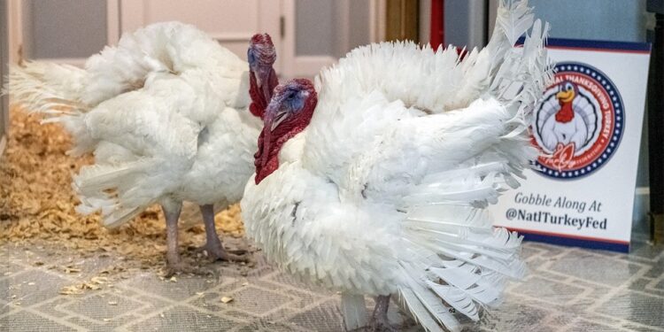 Gobble («engullir», en inglés) y Waddle («pavonearse») nacieron en julio en una granja de Carolina del Norte y pesan 52 y 50 libras (24 y 23 kilos) respectivamente Como marca la tradición, uno se convertirá en el pavo nacional de Acción de Gracias, festividad que se celebra el próximo jueves, y el otro será el suplente, aunque ambos serán indultados el martes.