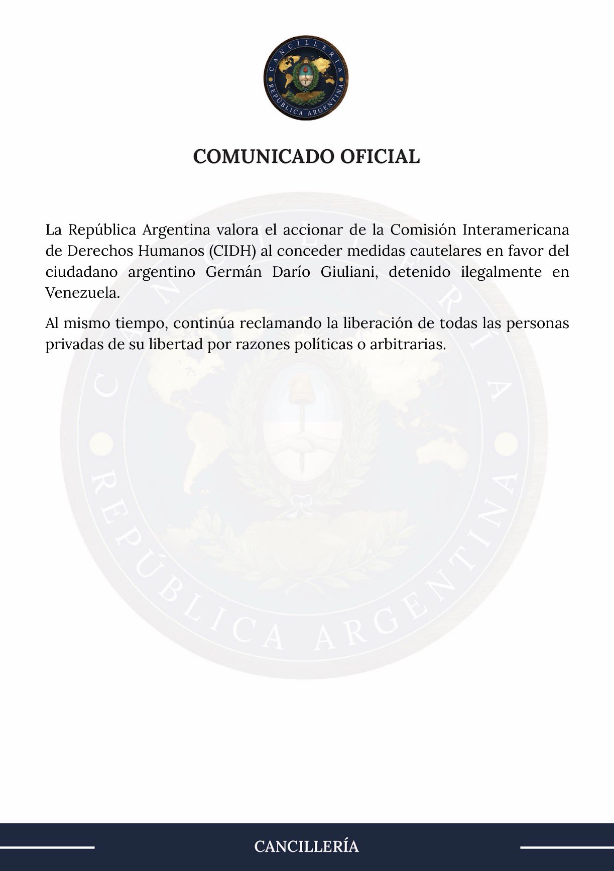 “La República Argentina valora el accionar de la Comisión Interamericana de Derechos Humanos (CIDH) al conceder medidas cautelares en favor del ciudadano argentino Germán Darío Giuliani, detenido ilegalmente en Venezuela. Al mismo tiempo, continúa reclamando la liberación de todas las personas privadas de su libertad por razones políticas o arbitrarias”, detalla el escrito.