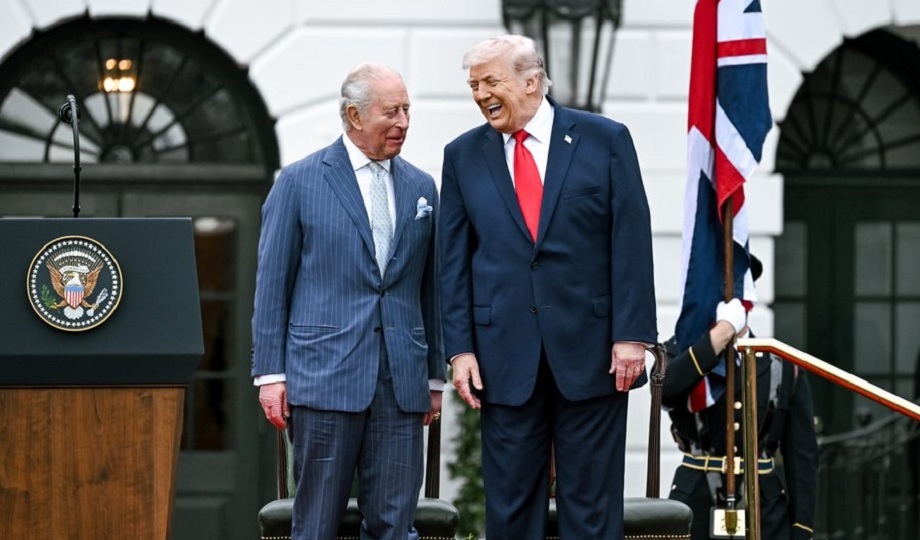 En la imagen aparecen Trump y Carlos III en uno de los jardines de la Casa Blanca durante la ceremonia militar con la que dio la bienvenida al monarca, en la primera visita de Estado desde su regreso al ejecutivo en 2025.