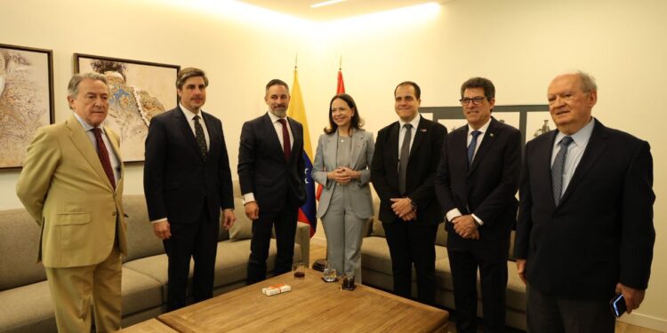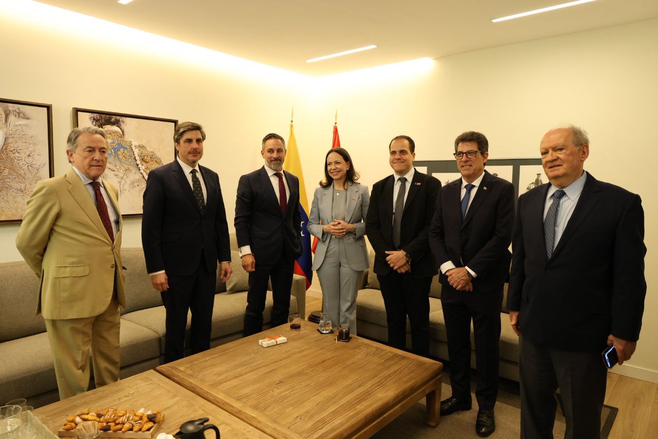 El líder del partido Vox, Santiago Abascal, recibió este viernes a la líder venezolana y Premio Nobel de la Paz, María Corina Machado, en la sede de la Fundación Disenso, el think tank del partido español.