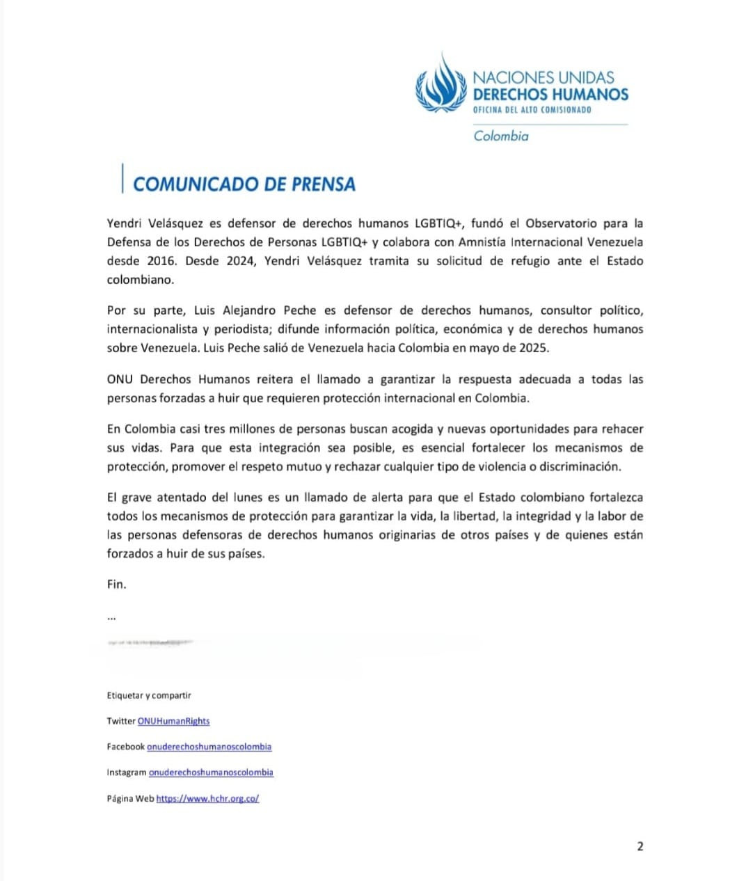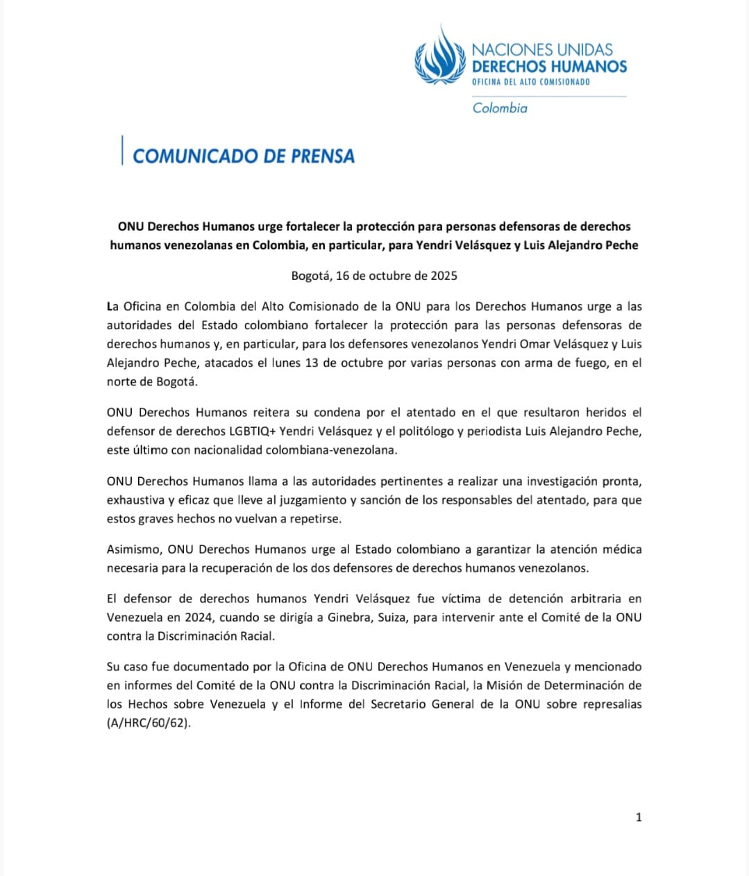 La Oficina en Colombia del Alto Comisionado de las Naciones Unidas para los Derechos Humanos instó al Estado colombiano a fortalecer las medidas de protección para las personas defensoras de derechos humanos, con especial atención a los venezolanos Yendri Omar Velásquez y Luis Alejandro Peche, quienes fueron atacados con armas de fuego el 13 de octubre en el norte de Bogotá.