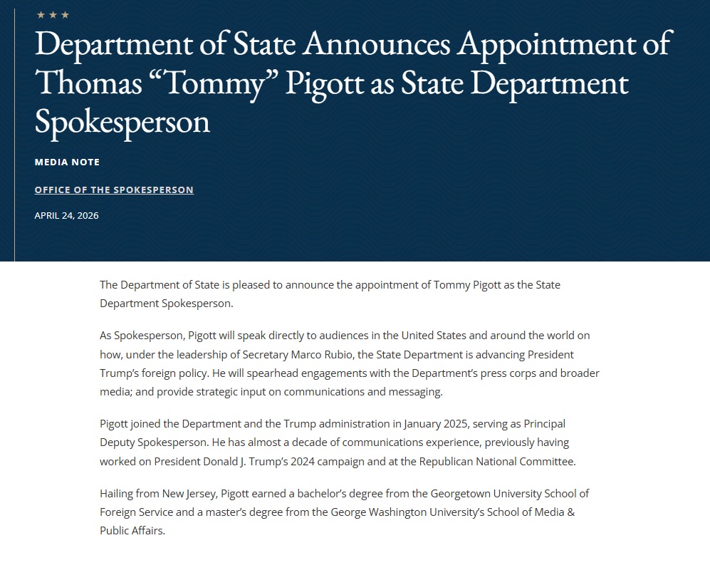 «En su calidad de portavoz, Pigott se dirigirá directamente al público de Estados Unidos y de todo el mundo para explicar cómo, bajo el liderazgo del secretario Marco Rubio, el Departamento de Estado está impulsando la política exterior del presidente Trump. Encabezará las relaciones con la prensa acreditada ante el Departamento y con los medios de comunicación en general, y aportará ideas estratégicas en materia de comunicación y mensajes», explicó el Departamento de Estado en un comunicado oficial.
