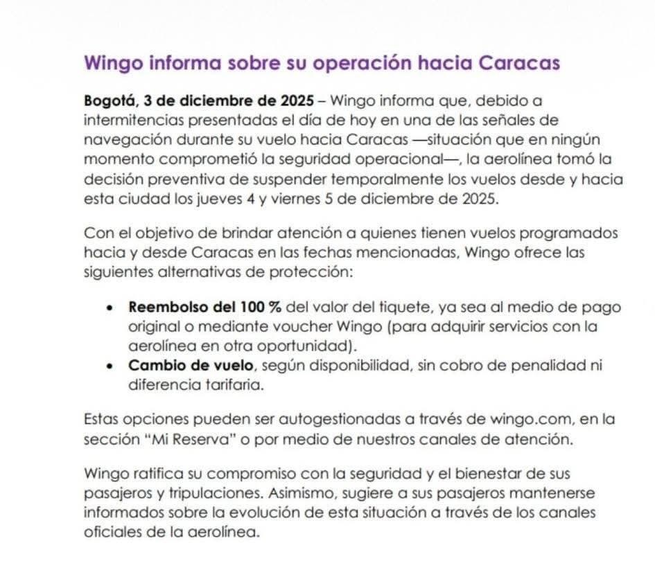 La aerolínea colombiana Wingo anunció la suspensión temporal de sus vuelos desde y hacia la ciudad de Caracas para los días jueves 4 y viernes 5 de diciembre de 2025, debido a que se registraron “intermitencias en una de las señales de navegación durante un vuelo hacia la capital venezolana”.