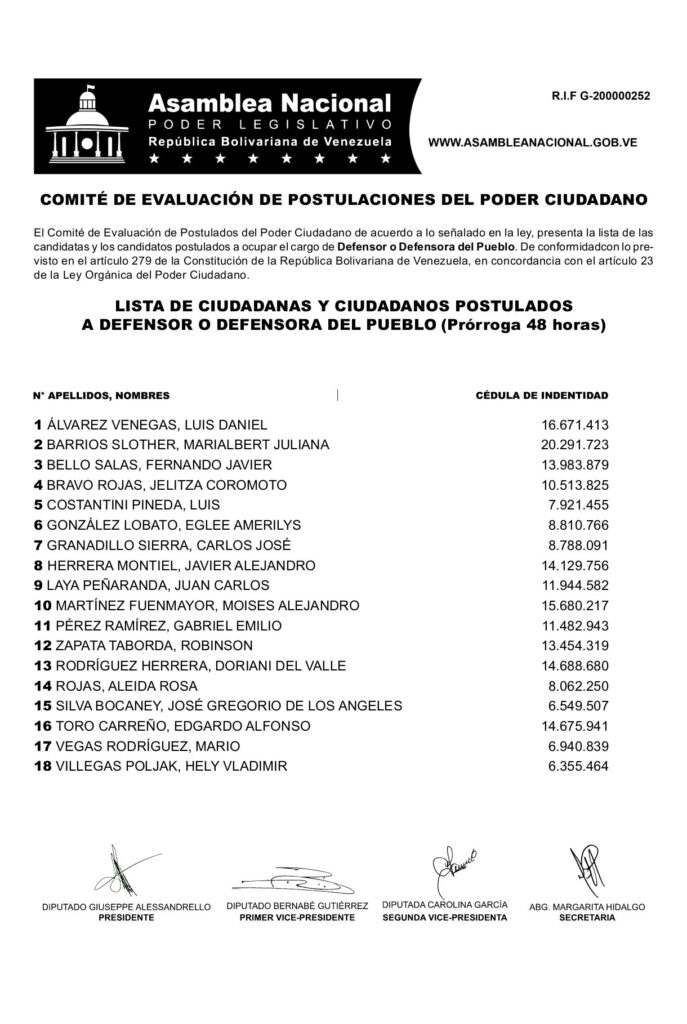 La Asamblea Nacional controlada por el chavismo publicó este viernes una lista de 18 ciudadanos que se postularon de manera extemporánea para ocupar el cargo de Defensor o Defensora del Pueblo, tras la prórroga de 48 horas aprobada por el Comité de Evaluación de Postulaciones del Poder Ciudadano.