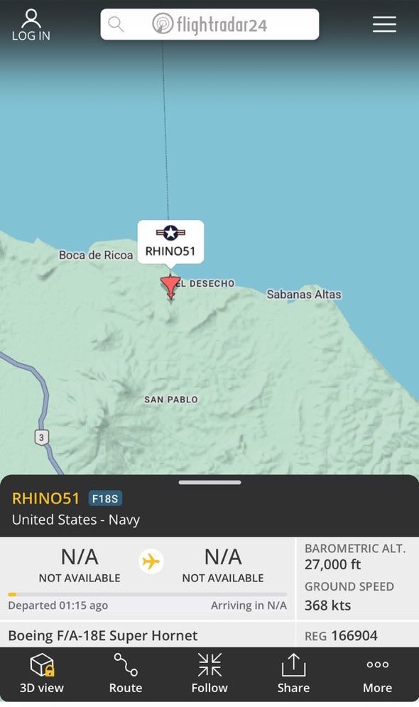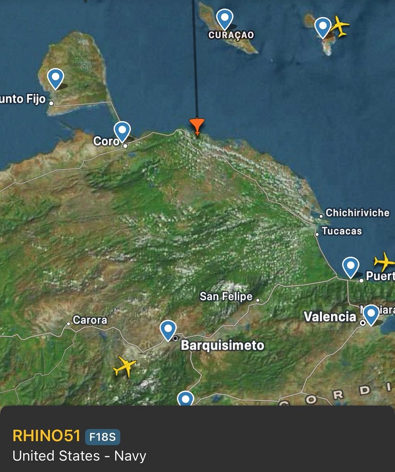 En horas de la noche de este viernes la página de monitoreo aéreo FlightRadar24, indicó que una aeronave F-18 de la Fuerza Aérea de los Estados Unidos habría ingresado a territorio venezolano.