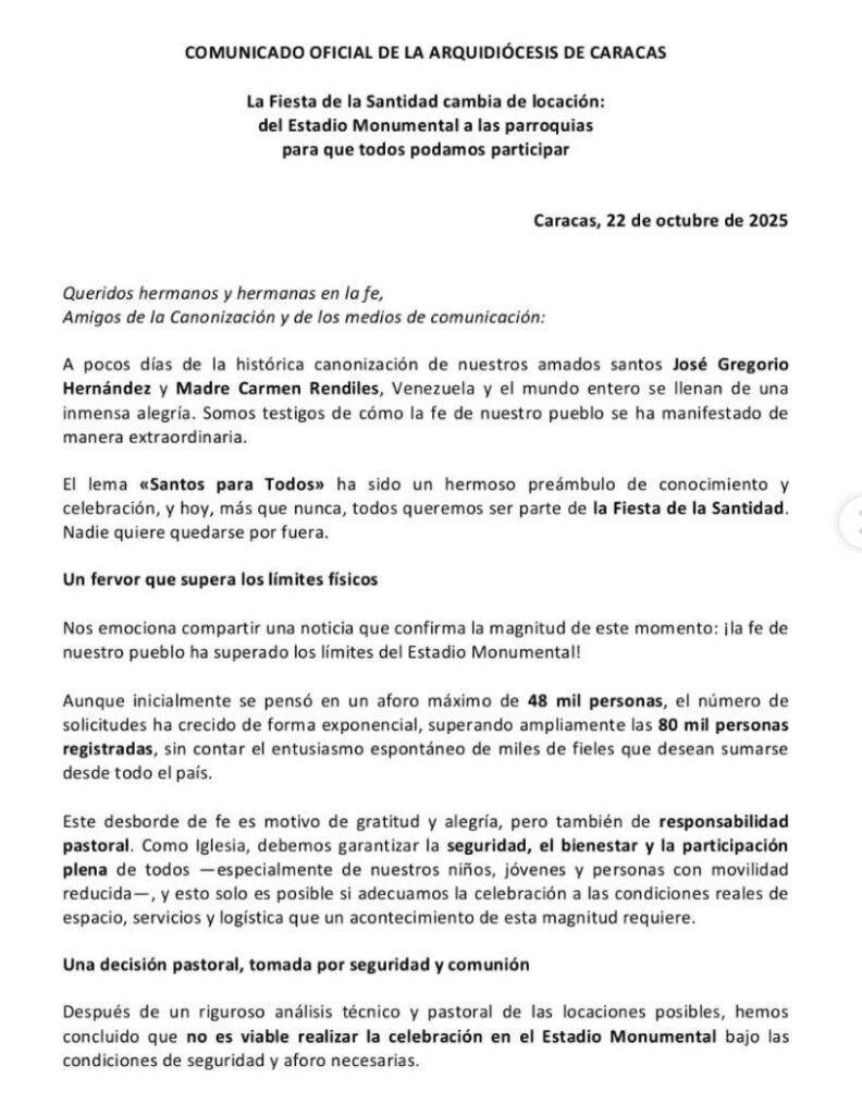 La Arquidiócesis de Caracas anunció que la «Gran Fiesta de la Santidad», para celebrar la canonización del Dr. José Gregorio Hernández y la Madre Carmen Rendiles, ya no se realizará en el Estadio Monumental, sino en cada parroquia y comunidad del país, con el fin de garantizar la participación de todos los fieles y las condiciones necesarias de seguridad y comunión.