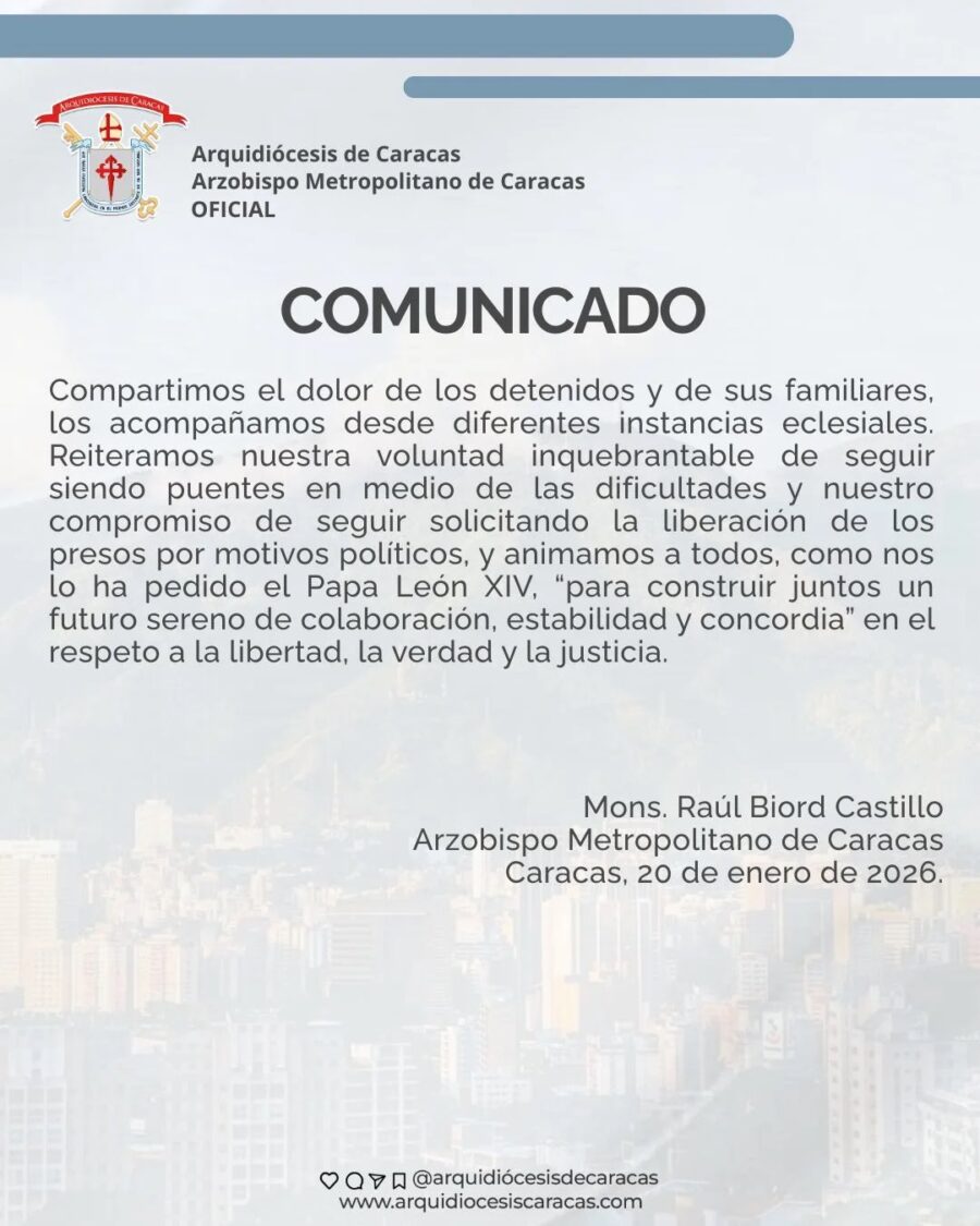 «Comprendemos el dolor de la Sra. Mariana González de Tudares y apoyamos su petición por la liberación de su esposo. (…) En ningún momento, se ha realizado en la arquidiócesis ninguna ‘extorsión’ o presión a familiares de detenidos ni a nadie«, destacó el Arzobispo Metropolitano de Caracas, Monseñor Raúl Biord Castillo, en dicho escrito, publicado en las redes sociales.
