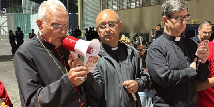 El cardenal Baltazar Porras, junto a otros representantes de la Iglesia católica y del Movimiento estudiantil, acompañó a los familiares de los presos políticos que continúan en vigilia a las puertas del centro de detención Zona 7 de la Policía Nacional Bolivariana (PNB), en Boleíta, para exigir su liberación inmediata.