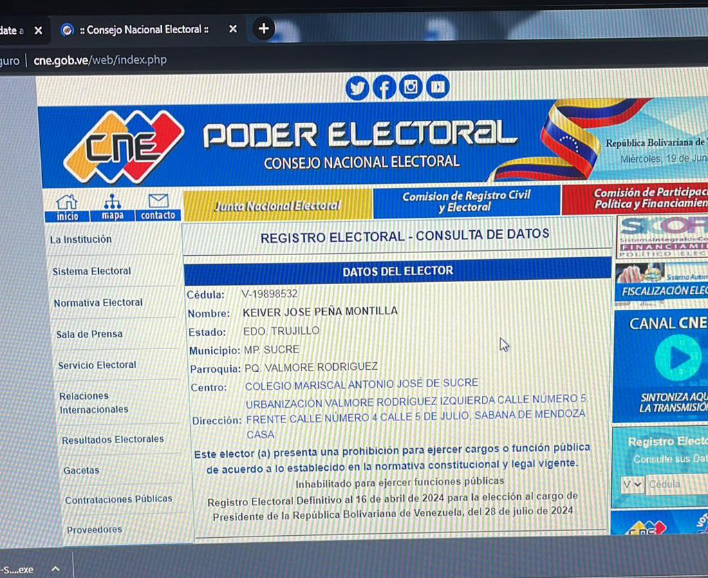 Ocho alcaldes del estado Trujillo también fueron sorprendidos este miércoles al conocer que en la página web del Consejo Nacional Electoral (CNE) aparecían inhabilitados para ejercer cargos públicos, tras mostrar su apoyo al candidato presidencial unitario, Edmundo González Urrutia.