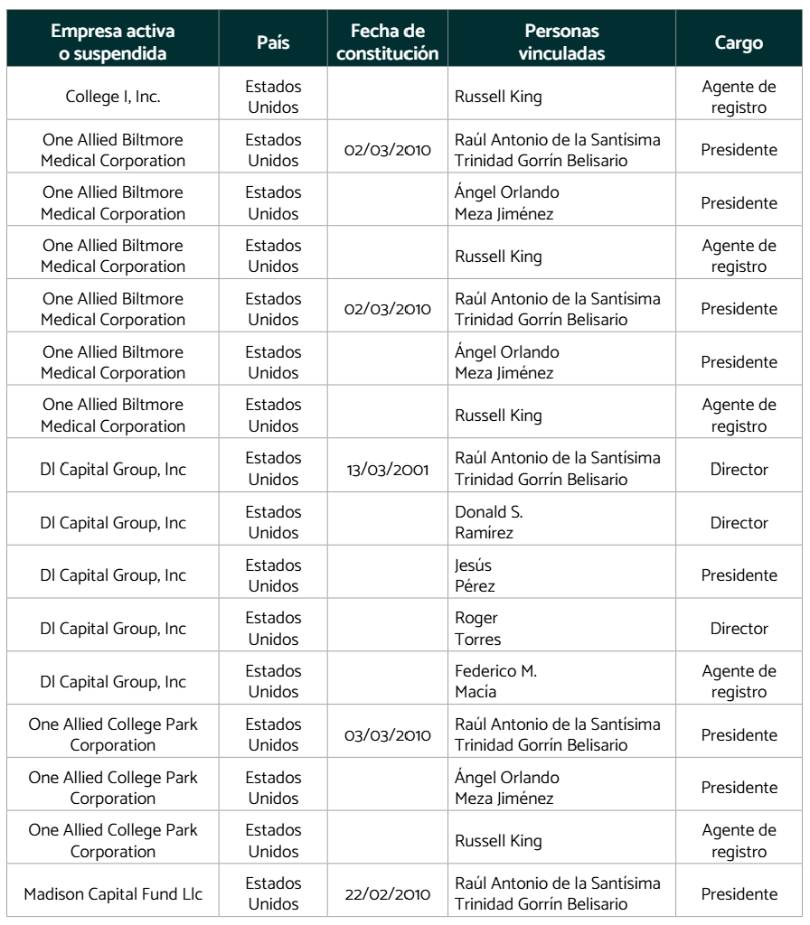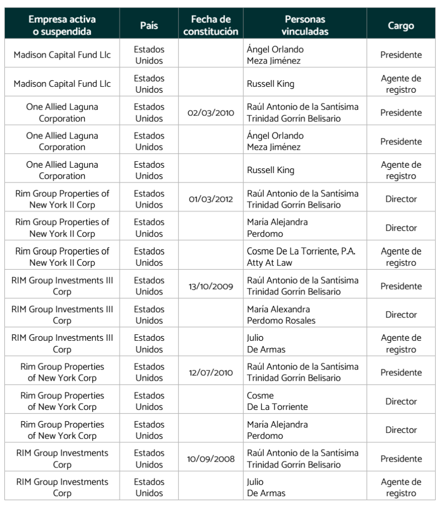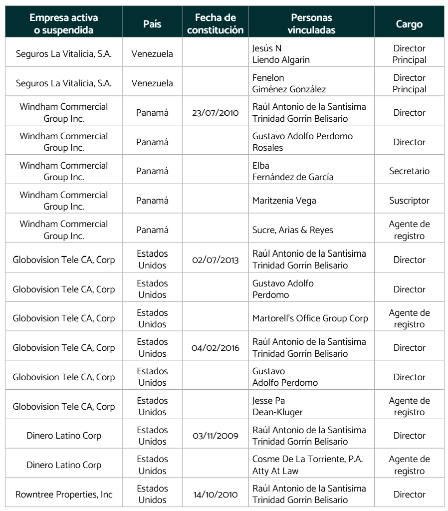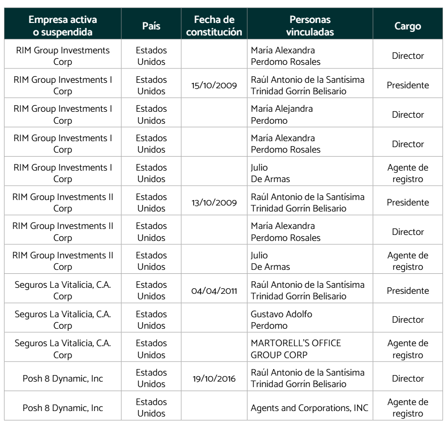 En los últimos 15 años, Gorrín ha creado o adquirido por lo menos 29 empresas, ubicadas en Estados Unidos, Venezuela, Panamá y en algunas islas del caribe. Estás compañías forman parte de su estructura corporativa extendida, con funciones clave como la adquisición de activos, triangulación financiera y registro de propiedad sobre bienes posteriormente incautados, lo cual sugiere su uso como vehículos de ocultamiento y legitimación de fondos.