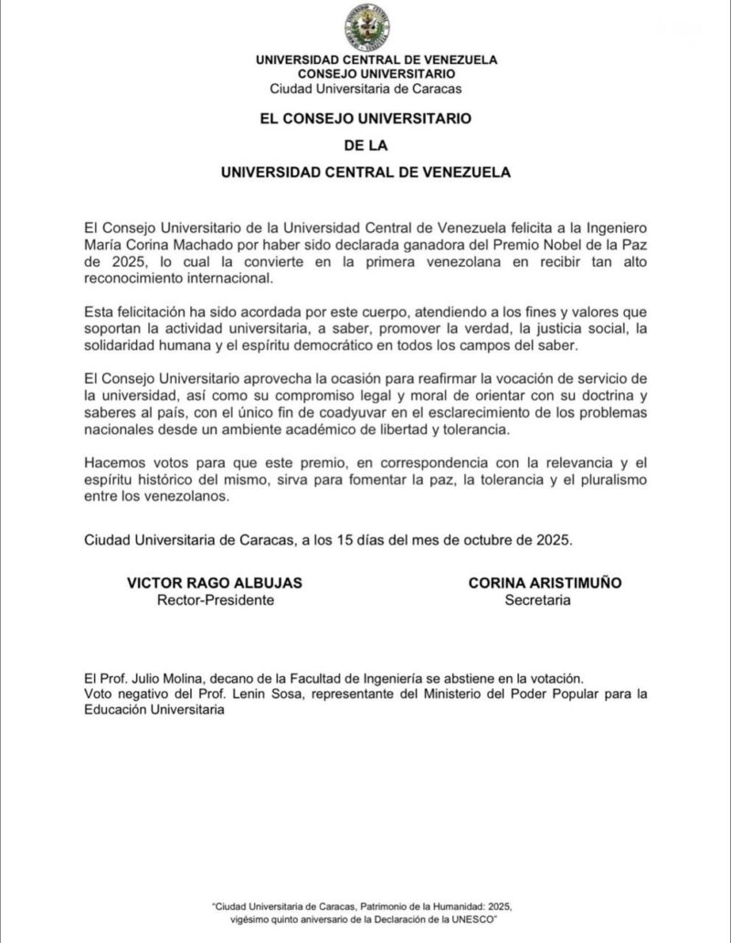 El Consejo Universitario de la Universidad Central de Venezuela (UCV) felicitó a la líder opositora María Corina Machado por haber sido declarada ganadora del Premio Nobel de la Paz 2025, convirtiéndose en la primera venezolana en recibir dicho reconocimiento.
