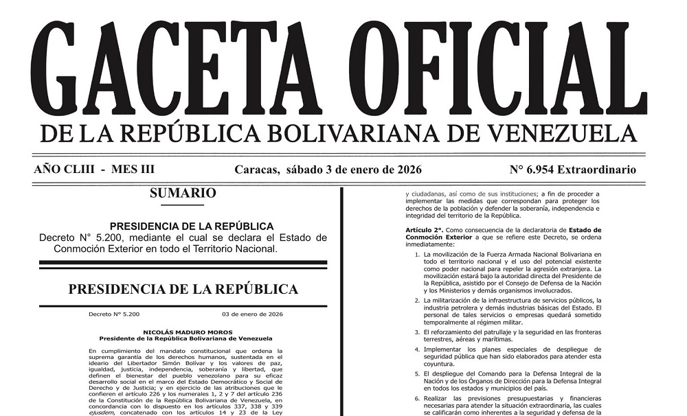 Este lunes fue publicado en la Gaceta Oficial Extraordinaria N.º 6.954, de fecha 3 de enero de 2026, el decreto de Estado de Conmoción Exterior en todo el territorio nacional, firmado por Nicolás Maduro antes de ser capturado por fuerzas militares de Estados Unidos, bajo el argumento de garantizar el orden interno, la defensa nacional y la protección de la población ante una situación extraordinaria de carácter externo.