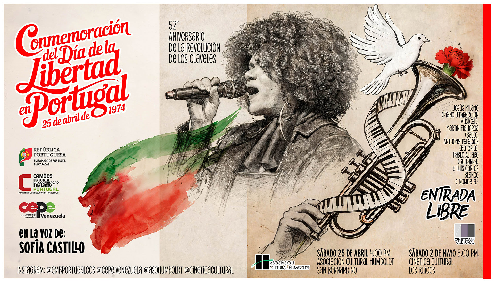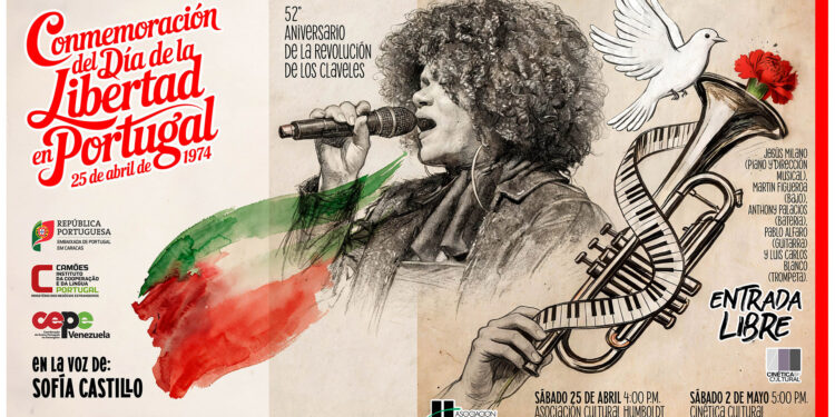 Bajo el nombre “Conmemoración del Día de la Libertad en Portugal: 25 de abril de 1974”, la agenda contempla dos presentaciones musicales de entrada libre: el 25 de abril en la Asociación Cultural Humboldt y el 2 de mayo en la Sala de Cinética Cultural. La propuesta reúne elementos de la cultura lusa y venezolana a través del jazz.