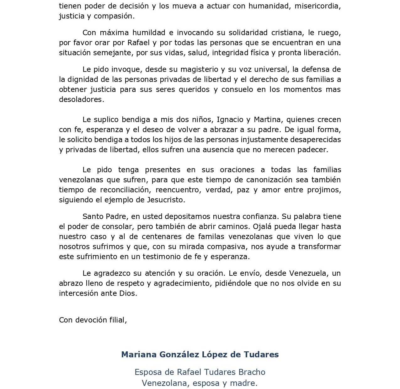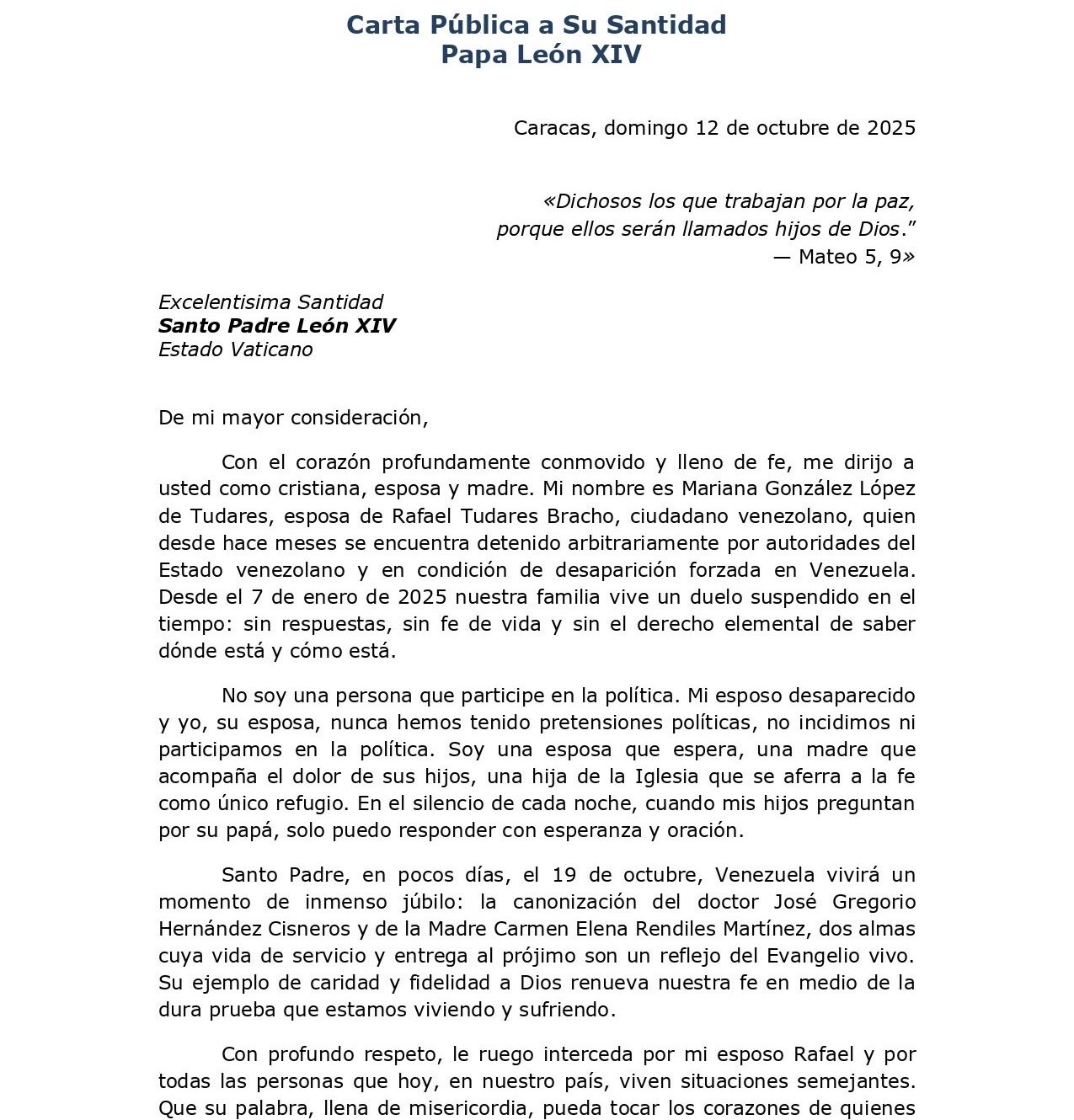 ` Esposa de Rafael Tudares envía carta al papa León XIV tras más de 278 días en desaparición forzada - Monitoreamos