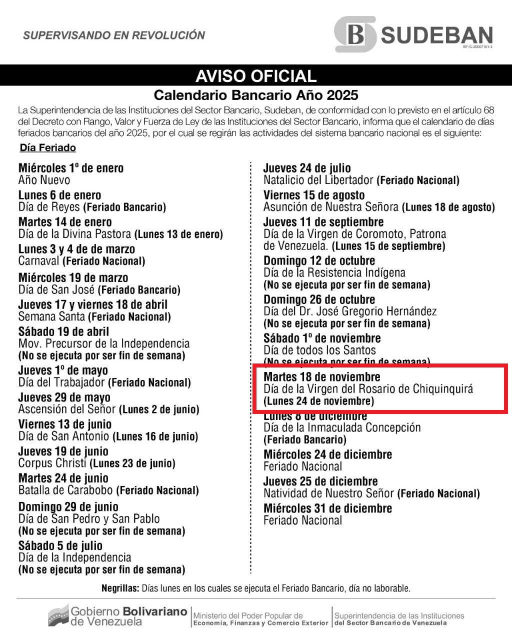 La Superintendencia de la Instituciones del Sector Bancario (Sudeban) informa que las entidades bancarias del país no laborarán este lunes 24 de noviembre por el Día de la Virgen del Rosario de la Chiquinquirá, que se celebró el martes 18.