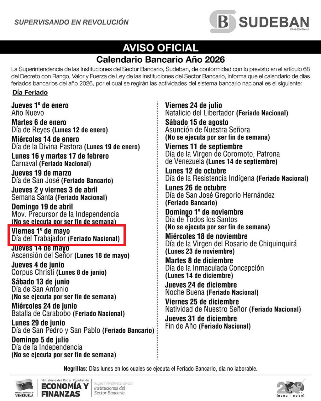 La Superintendencia de la Instituciones del Sector Bancario (Sudeban) informa que las entidades bancarias del país no laborarán este viernes 1° de mayo por el Día Internacional del Trabajador-
