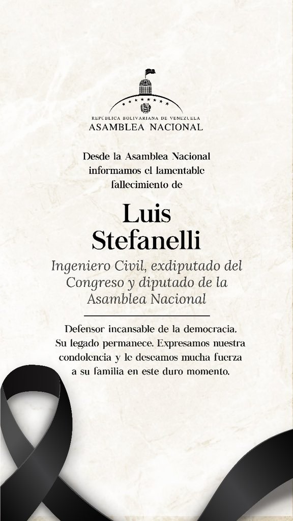La información fue confirmada por la AN en sus redes sociales: «Desde la Asamblea Nacional informamos el lamentable fallecimiento de Luis Stefanelli Ingeniero Civil, exdiputado del Congreso y diputado de la Asamblea Nacional. Delensor incansable de la democracia. Su legado permanece. Expresamos nuestra condolencia y le deseamos mucha fuerza a su familia en este duro momento».