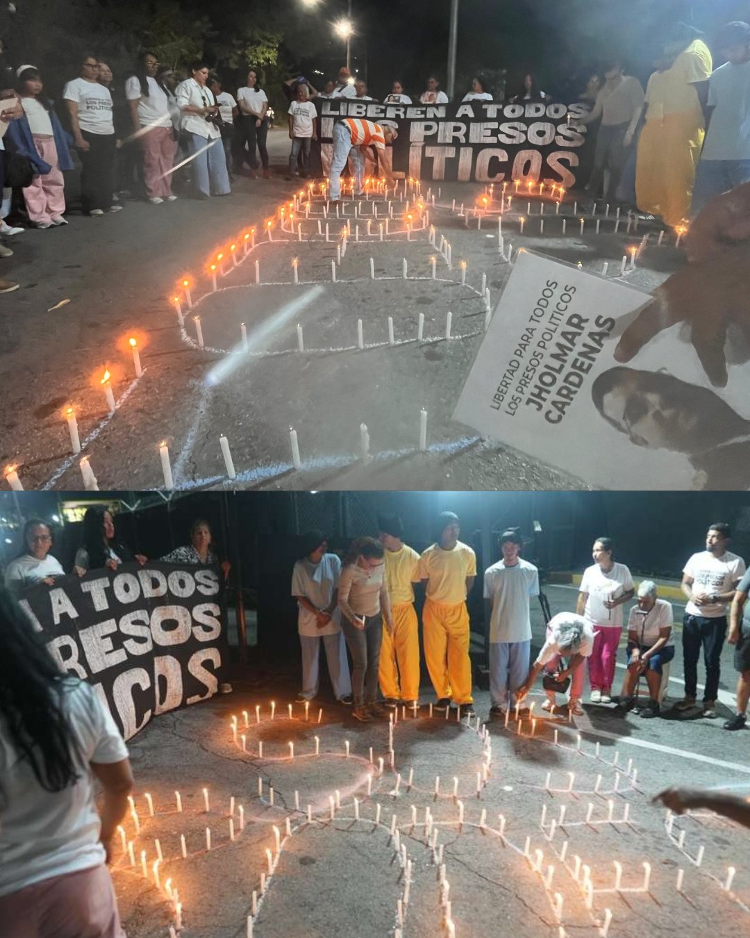 El grupo encendió varias velas que formaron las palabras «SOS Rodeo I», sostuvieron pancartas para exigir la liberación de todos los presos y algunos de los manifestantes se vistieron de color amarillo y usaron capuchas, para demostrar cómo son trasladados los detenidos de sus celdas hasta la zona de visitas.