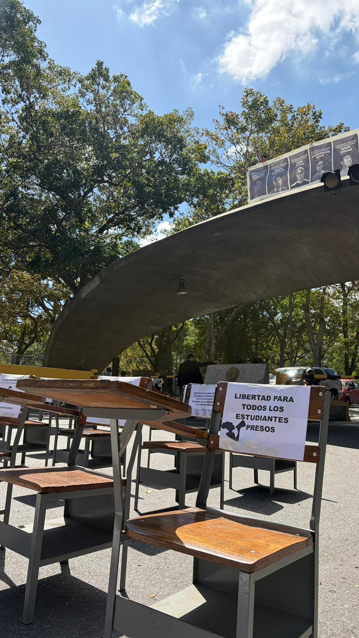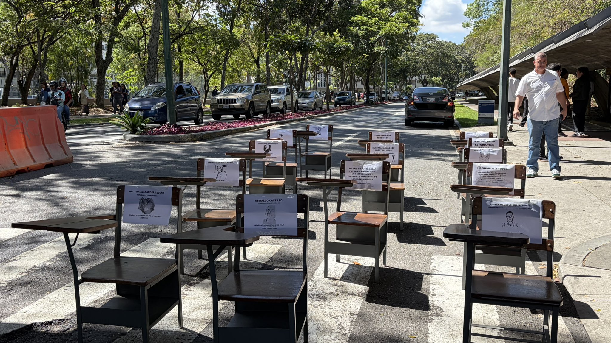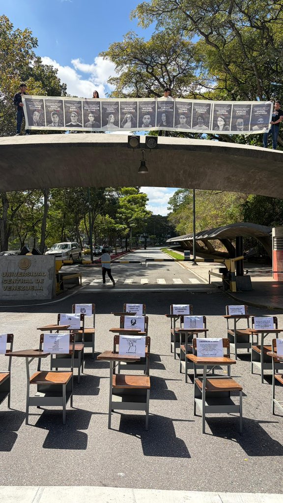 La manifestación, convocada por la Federación de Centros Universitarios de la UCV (FCU-UCV), consistió en un “pupitrazo” simbólico: los jóvenes colocaron pupitres vacíos en la Puerta Tamanaco de la UCV como representación de los espacios que hoy ocupan estudiantes encarcelados por razones políticas.