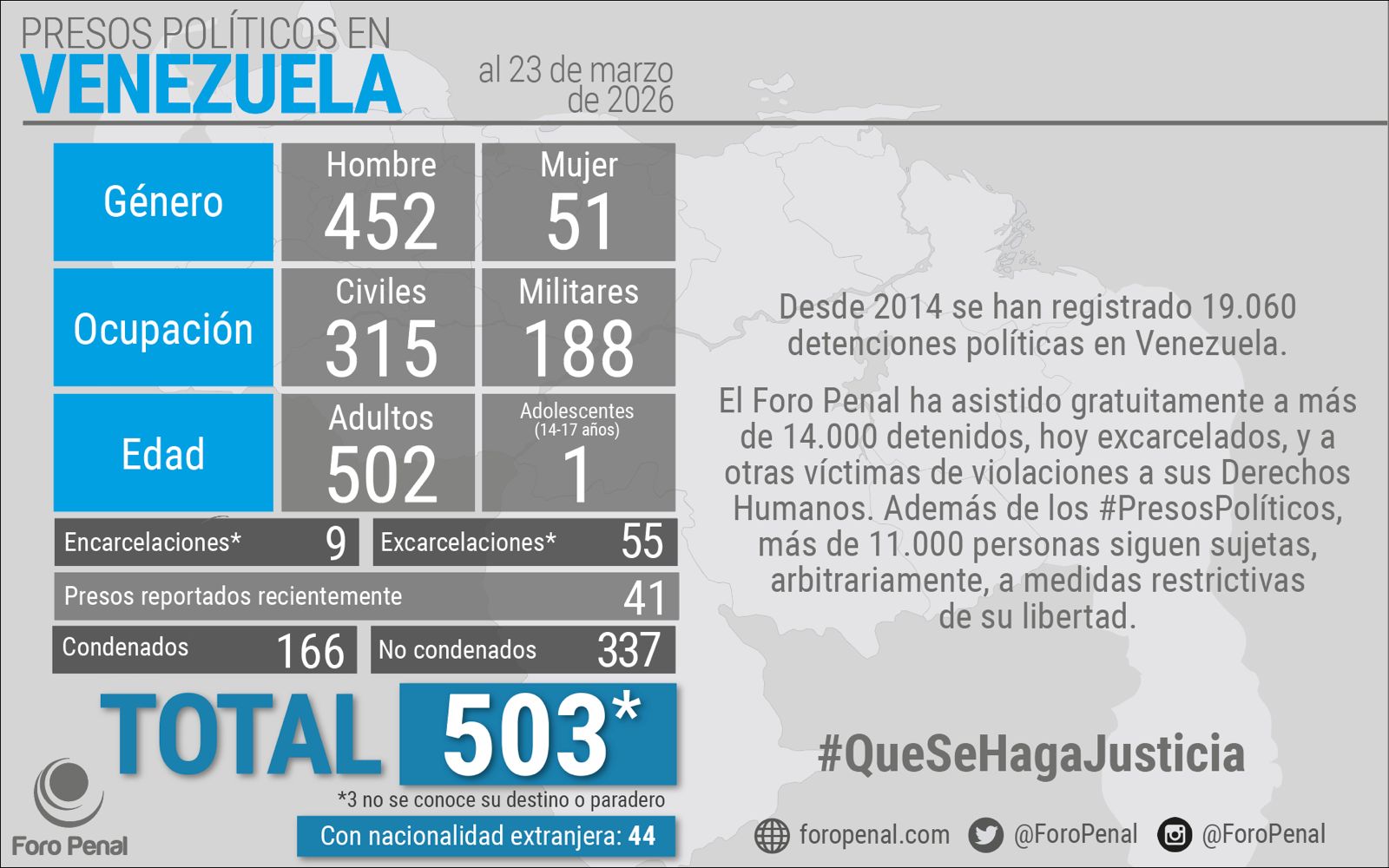 La ONG Foro Penal contabilizó hasta el 23 de marzo de 2026 al menos 503 presos políticos en Venezuela, entre ellos, 44 rehenes extranjeros, un adolescente (entre 14 y 17 años de edad) y tres detenidos con paradero desconocido.
