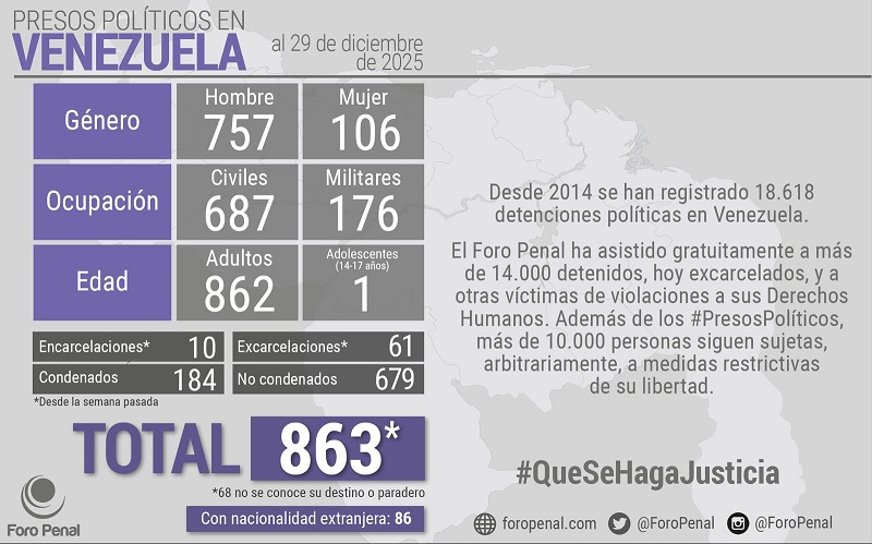 La ONG Foro Penal contabiliza 863 los presos políticos en Venezuela -hasta el 29 de diciembre pasado- tras las excarcelaciones del 25 de diciembre, de los cuales 757 son hombres y 106 mujeres, según el boletín actualizado y difundido este domingo 4 de enero.