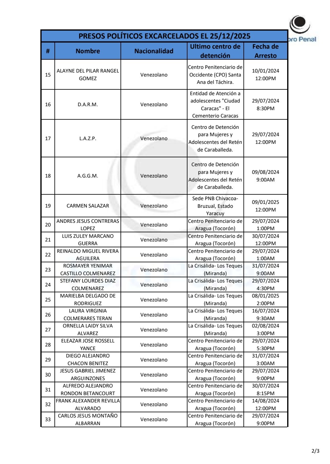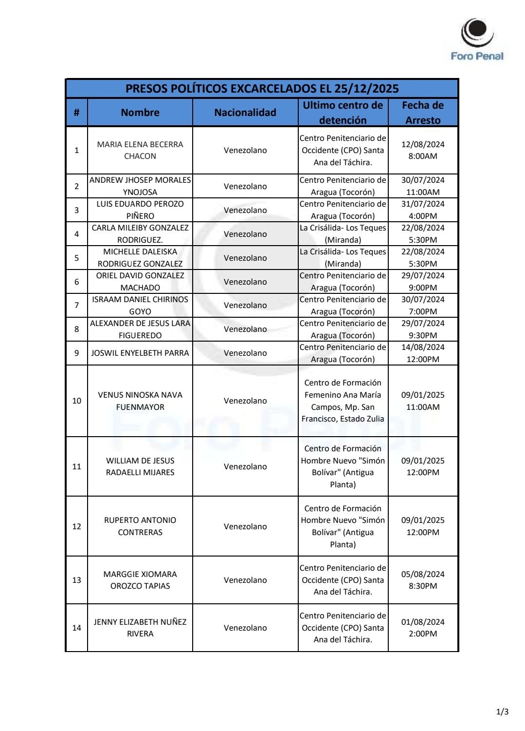 ` Foro Penal publica lista confirmada de 45 presos políticos excarcelados este 25 de diciembre - Monitoreamos