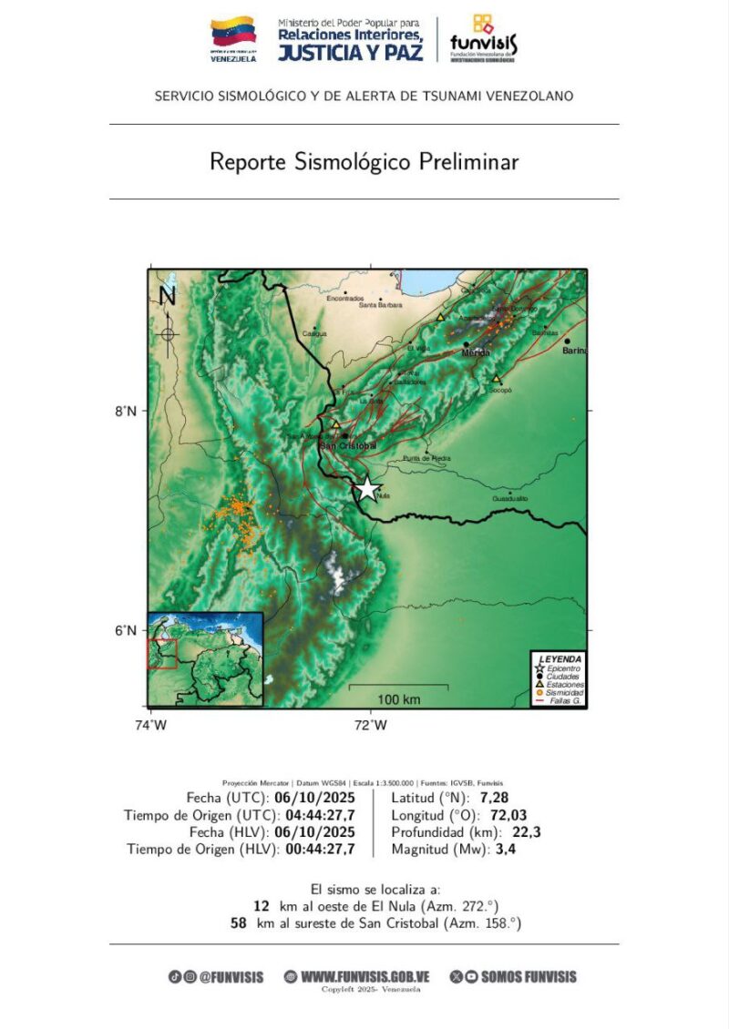 El primer movimiento telúrico ocurrió a las 12:44 de la madrugada de este lunes, de magnitud 3.4 con profundidad 22.3 km y epicentro a 12 km al oeste de El Nula (Apure).