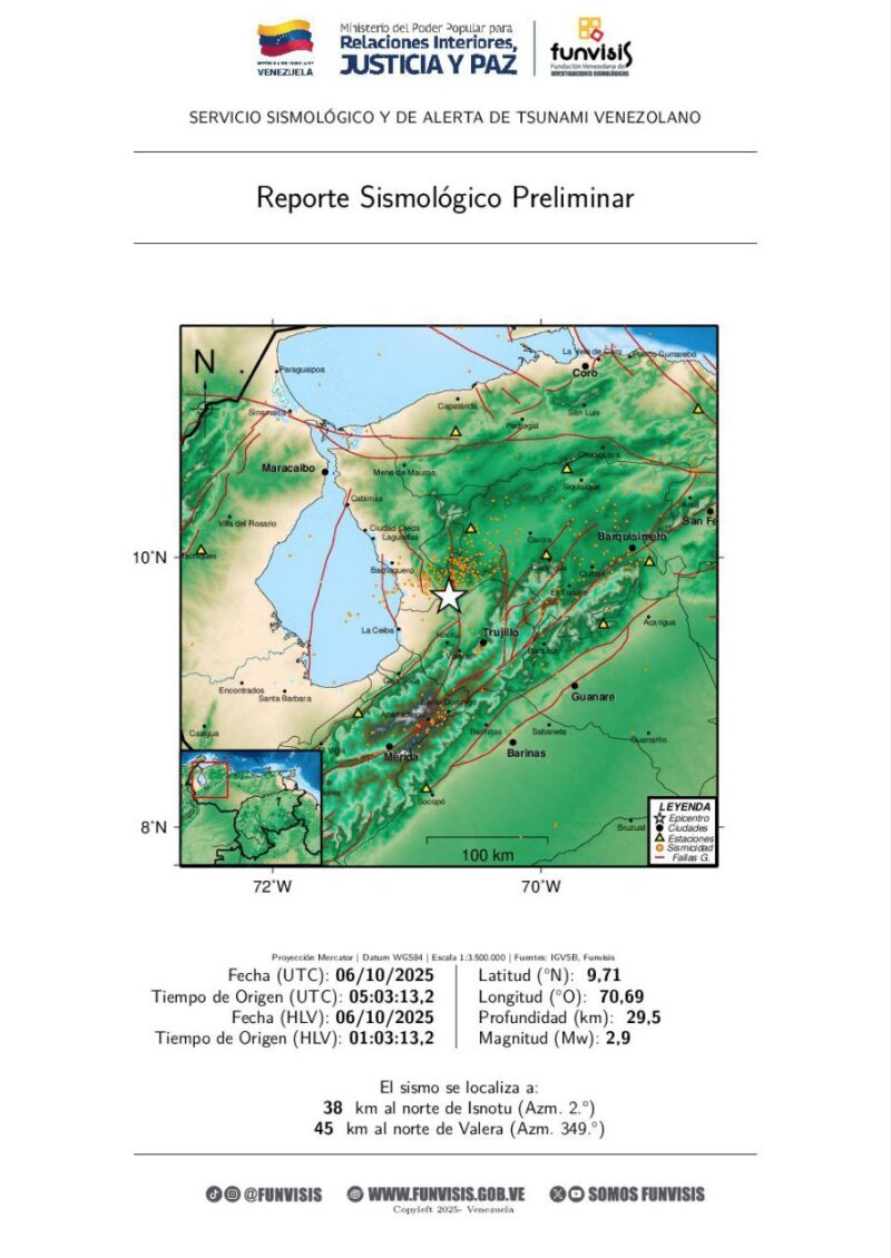 El segundo Funvisis lo registró a la 1:03 de la madrugada, de magnitud 2.9 con profundidad 29.5 km y epicentro a 38 km al norte de Isnotú (Trujillo).