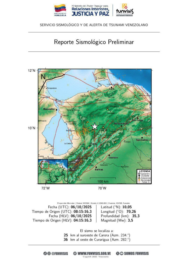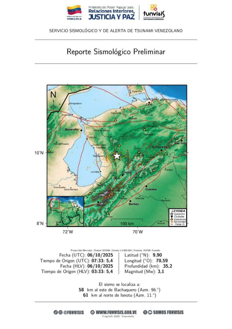 La Fundación Venezolana de Investigaciones Sismológicas (Funvisis) registró este lunes 6 de octubre al menos cinco sismos en los estados Apure, Trujillo, Zulia, Lara y Sucre, sin que se reportaran daños materiales ni pérdidas humanas.