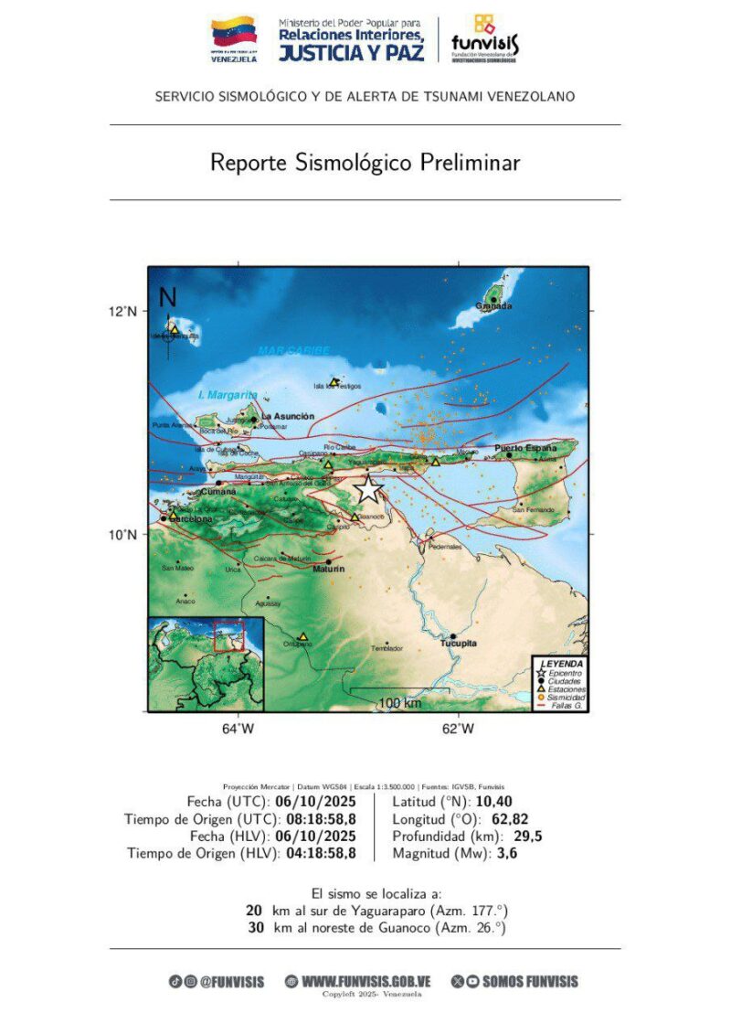 El quinto ocurrió a las 4:18 de madrugada, de magnitud 3.6 y profundidad de 29.5 km, con epicentro a 20 km al sur de Yaguaraparo (estado Sucre).