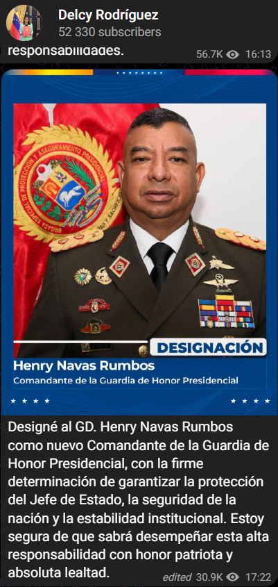 ”Designé al GD. Henry Navas Rumbos como nuevo Comandante de la Guardia de Honor Presidencial, con la firme determinación de garantizar la protección del Jefe de Estado, la seguridad de la nación y la estabilidad institucional. Estoy segura de que sabrá desempeñar esta alta responsabilidad con honor patriota y absoluta lealtad”, escribió Rodríguez en su canal de Telegram.